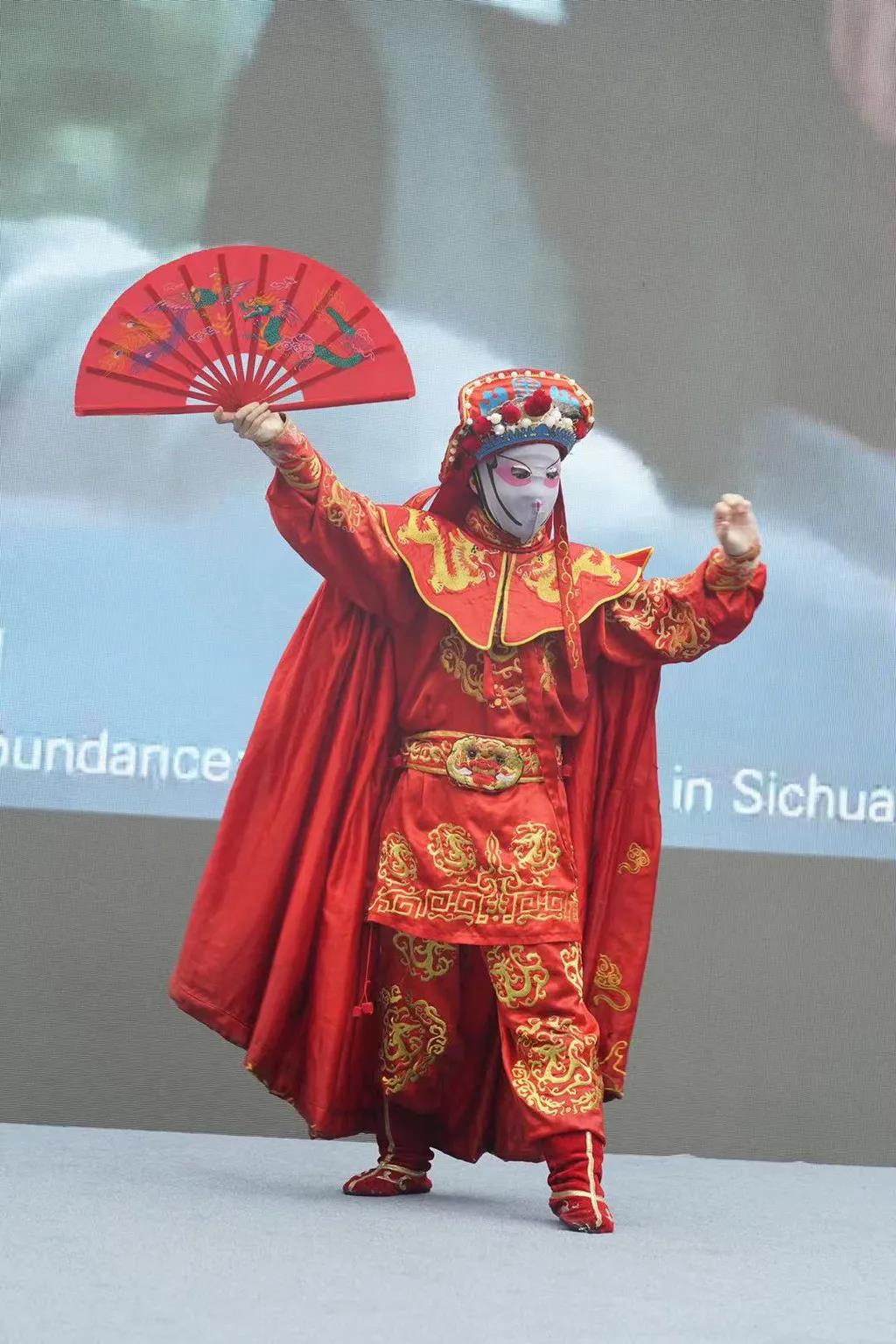 抬手一变,转身一变,掌声雷动间隙脸再变!30秒钟之间,近十张脸谱的频繁切换,让在场观众感受了一场精彩绝伦的川剧变脸,频频感叹四川传统文化的独特魅力。随着热情的蔓延,一场以“萌宠”风为主题的熊猫快闪表演让现场气氛活跃起来,让大熊猫这一四川文旅名片更加生动有趣,成为焦点。