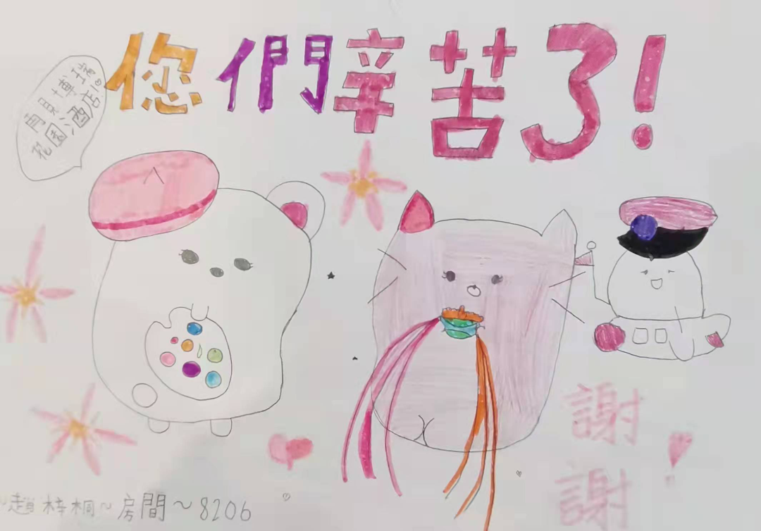 这幅画来自博瑞花园酒店8206房间的一位小住客:赵梓桐。童真的绘画,无声的表达。一句“谢谢!”“你们辛苦了!”,是小小的她对博瑞酒店疫情防控工作最美的肯定,让我们在疫情面前感觉到浓浓的暖意。