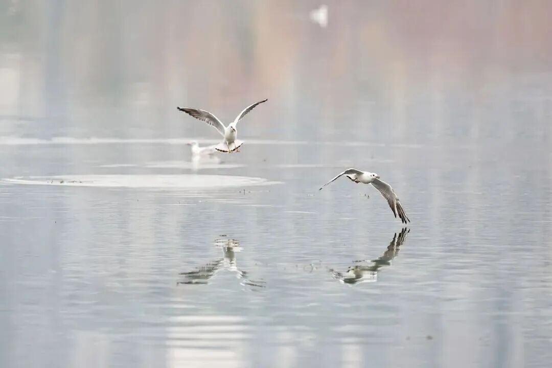 它们时而如雪花般漫天飞舞,时而如芭蕾舞者轻点水面,成群结队地在湖面上空划出优美的弧线。
