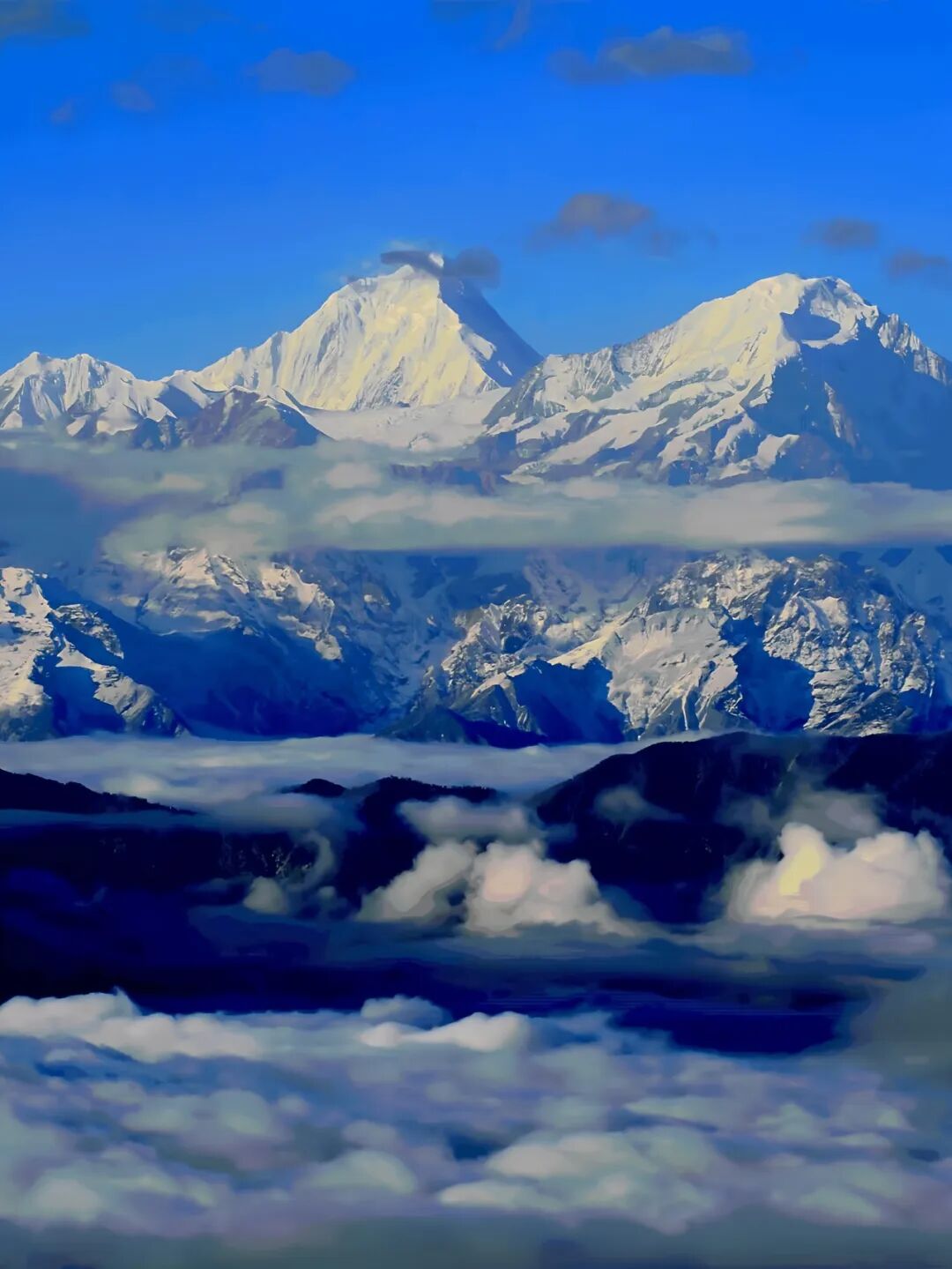 站在这里,贡嘎雪山、四姑娘山、峨眉山尽收眼底,360°无死角的雪山环抱,像一场视觉的盛宴。