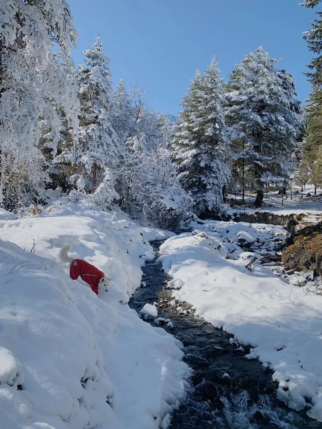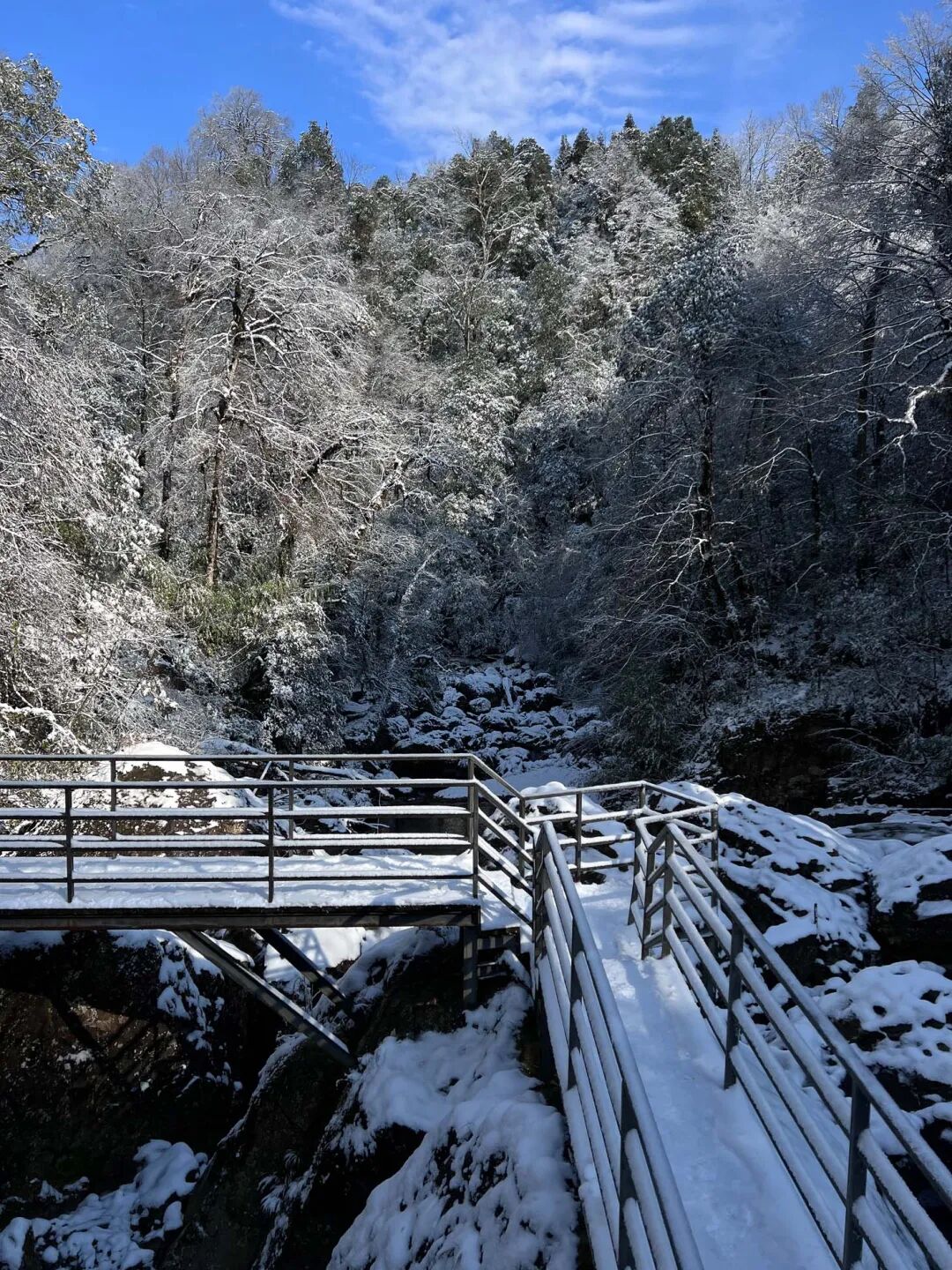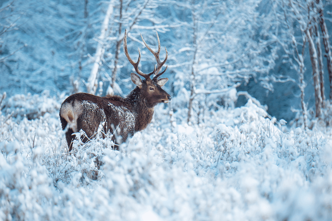 森林披上银装,瀑布冻成冰帘,偶尔还能遇见觅食的水鹿,在雪地里留下一串串脚印。
