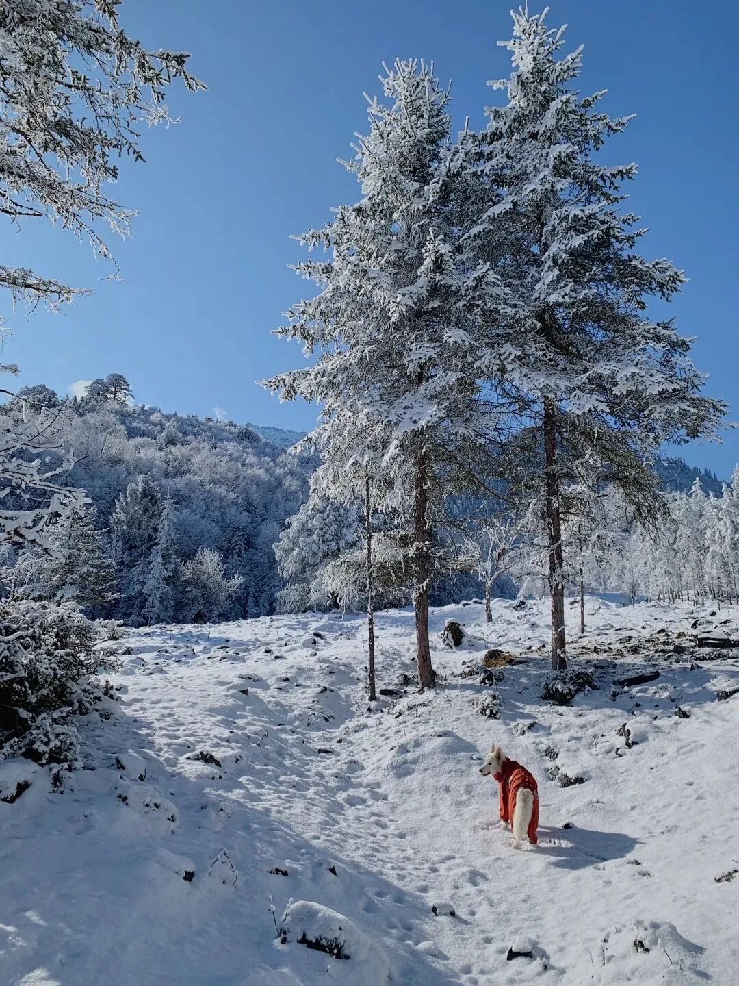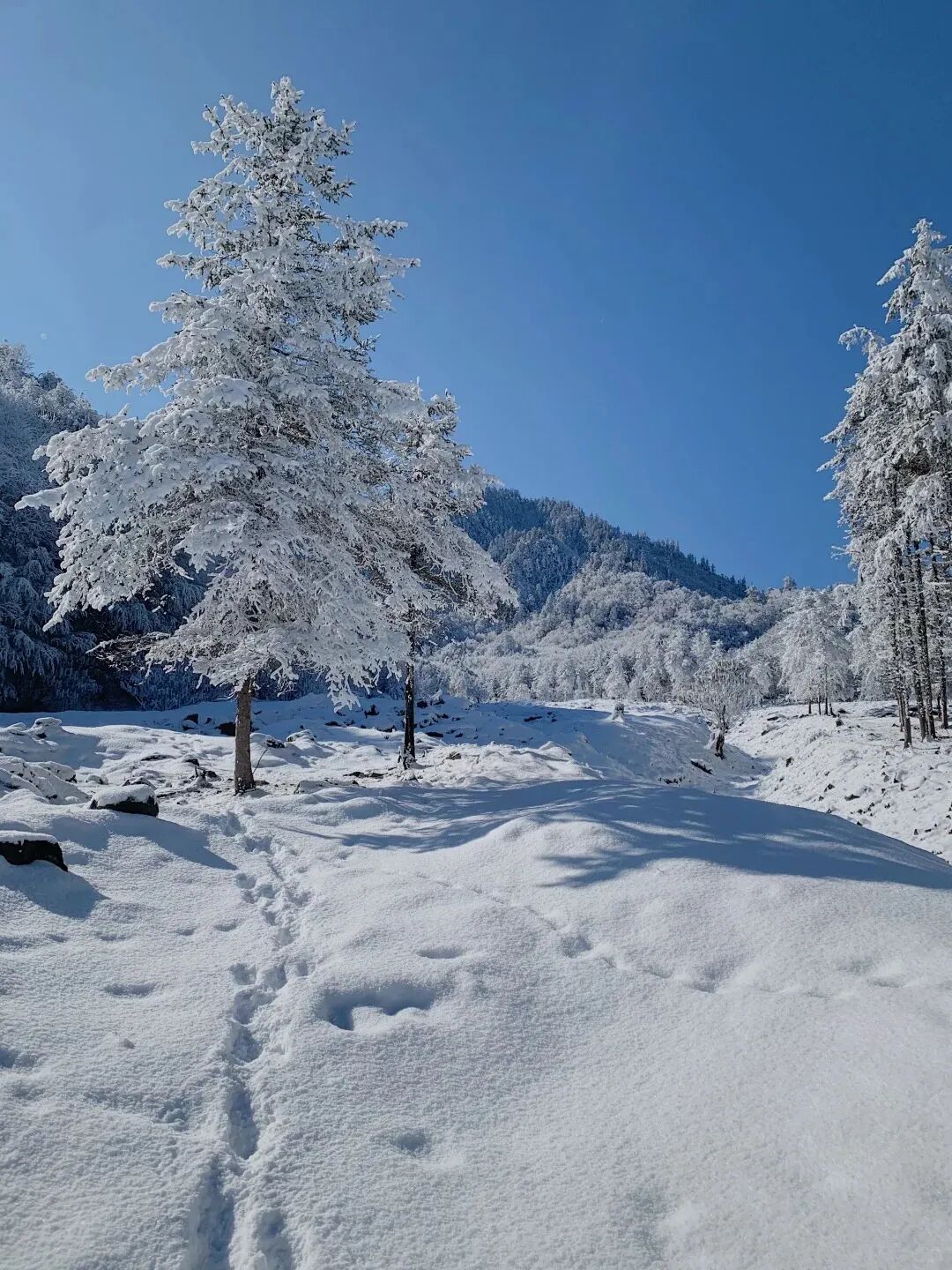 白雪皑皑的树木,看不到头的雪原,和蓝色的天空交相辉映,构成了这片天地冬日里纯美的画卷。